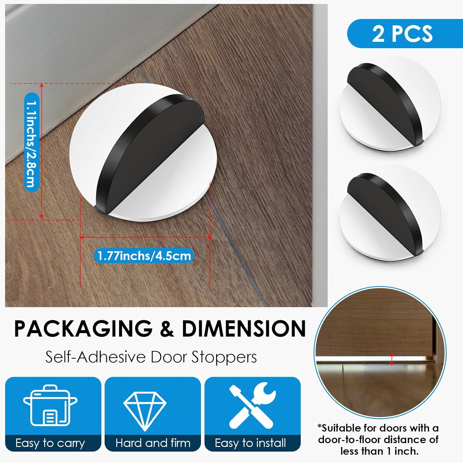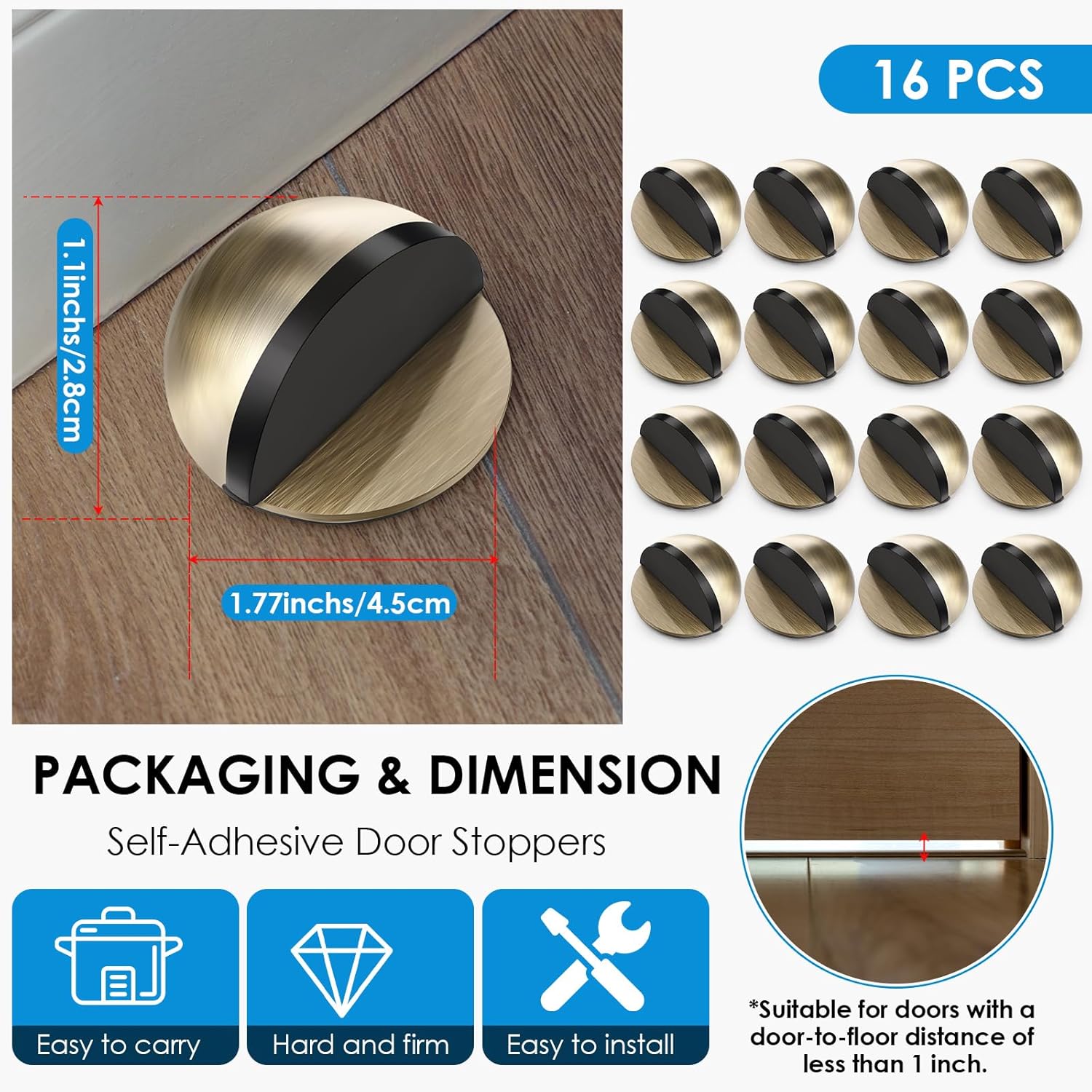 Features: Experience the remarkable durability of our door stops, manufactured using stainless steel. This material ensures the door stops not only have a sleek, glossy finish but also provide longevity and robustness. They are built to last, providing you with reliable and consistent performance, so you don't have to worry about changing your door stops often. Place them at your doorways, and witness their enduring efficiency. Specifications: Material: Stainless Steel Color: black Size: 1.77 x 1.77 x 1.1 inches/ 4.5 x 4.5 x 2.8 cm Package includes: 16 x Door Stoppers Notes: Manual measurement, please allow slight errors on size. The color may exist a slight difference due to different screen displays