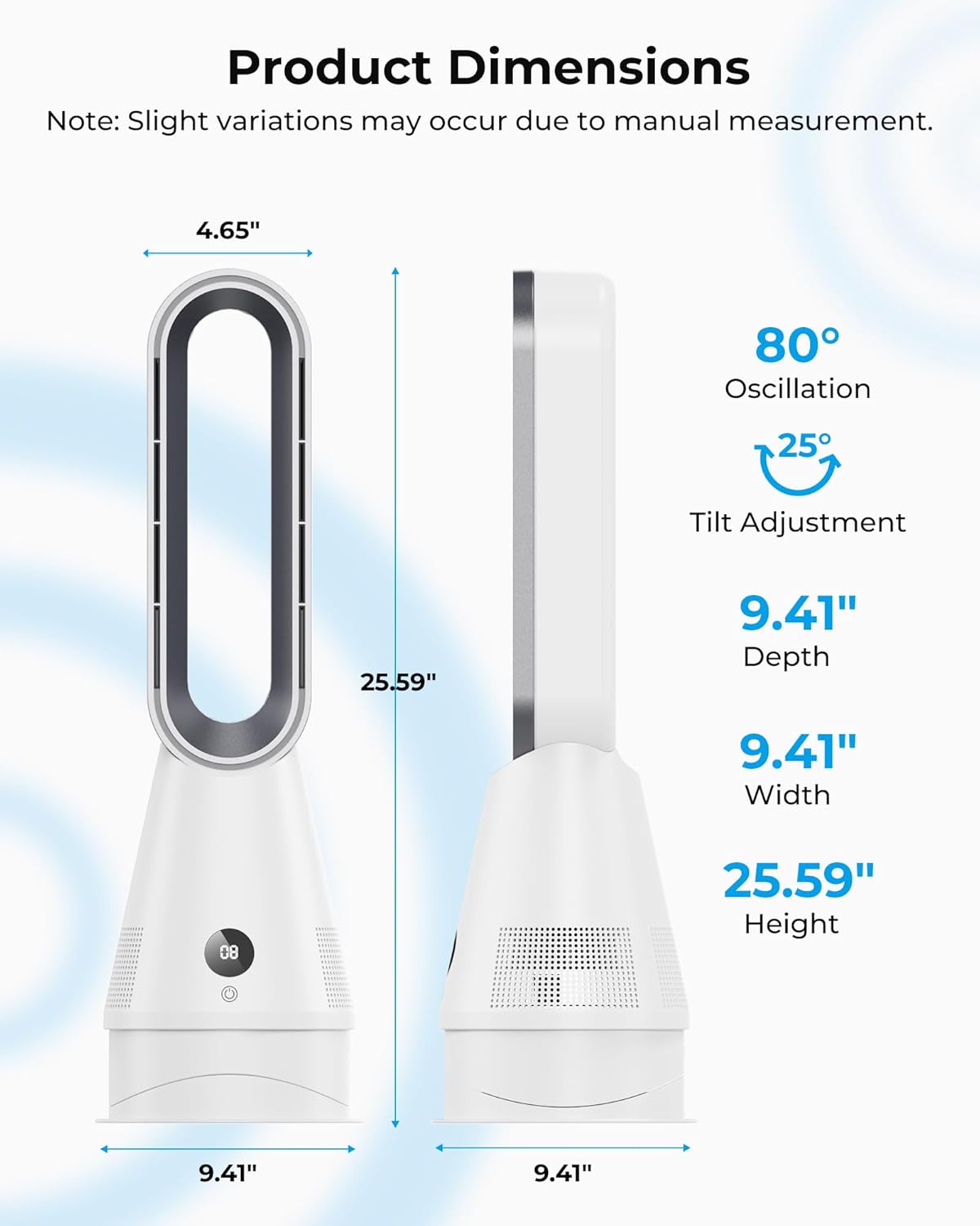 | Special Features | Adjustable Speed, Adjustable Temperature, Bladeless, Digital Display, Electronic Thermostat, Fast Heating, Flame Resistant, Lightweight, Noiseless, Oscillating, Overheat Protection, Portable, Remote Control, Tip-Over Protection, On Off Timer, Energy Efficient |