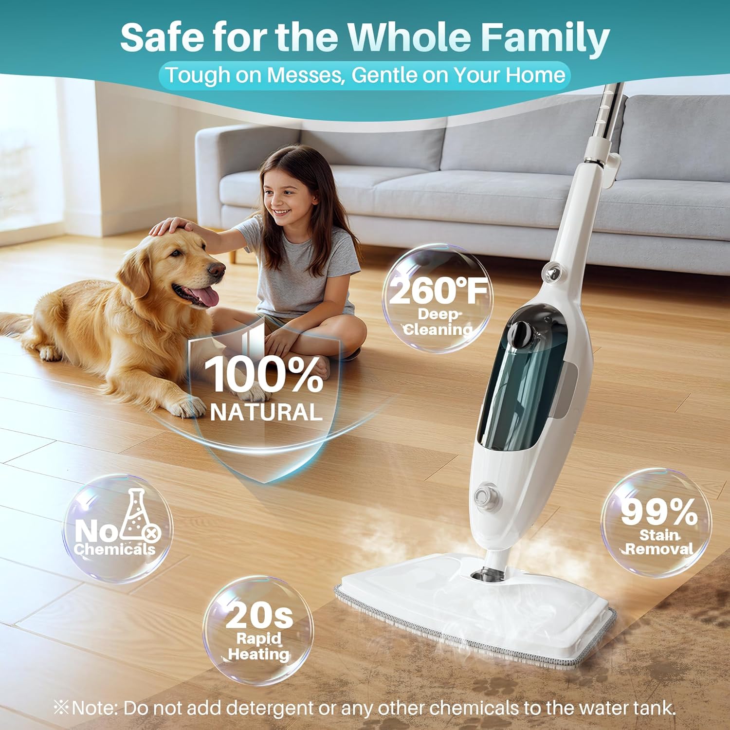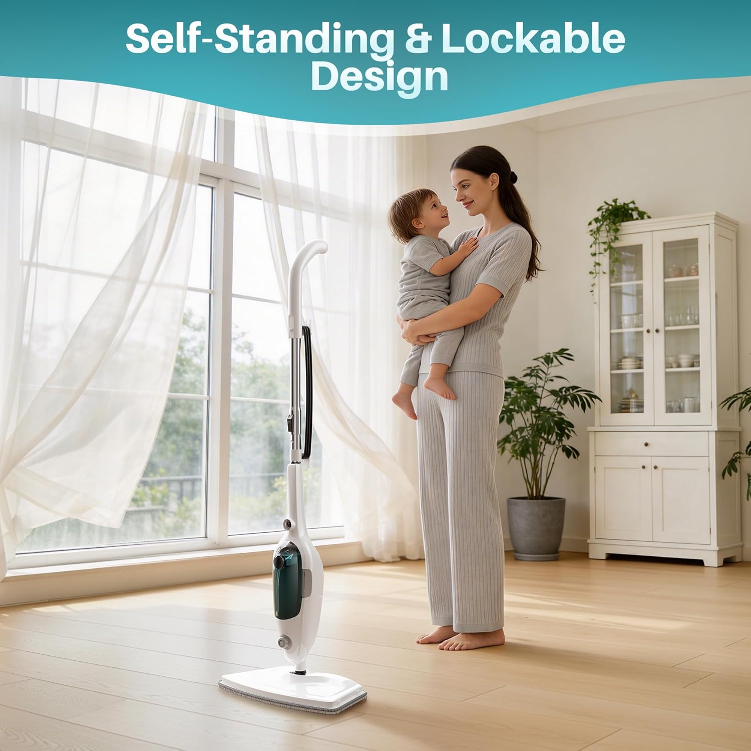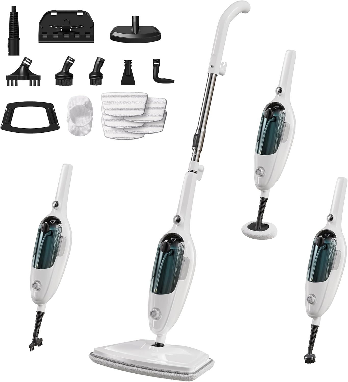 | Included Components | Carpet glider x1, Accessory adaptor x1, Angle nozzle x1, Round brush x1, Flat brush x1, Ironing brush x1, Large round brush x1, Small cloth x1, Microfiber pads x3, Steam Mop x1, 23 ft power cord x1, Removable water tank x1, Telescopic rod and grip x1, Window cleaning tools x1, Scraping tool x1 |