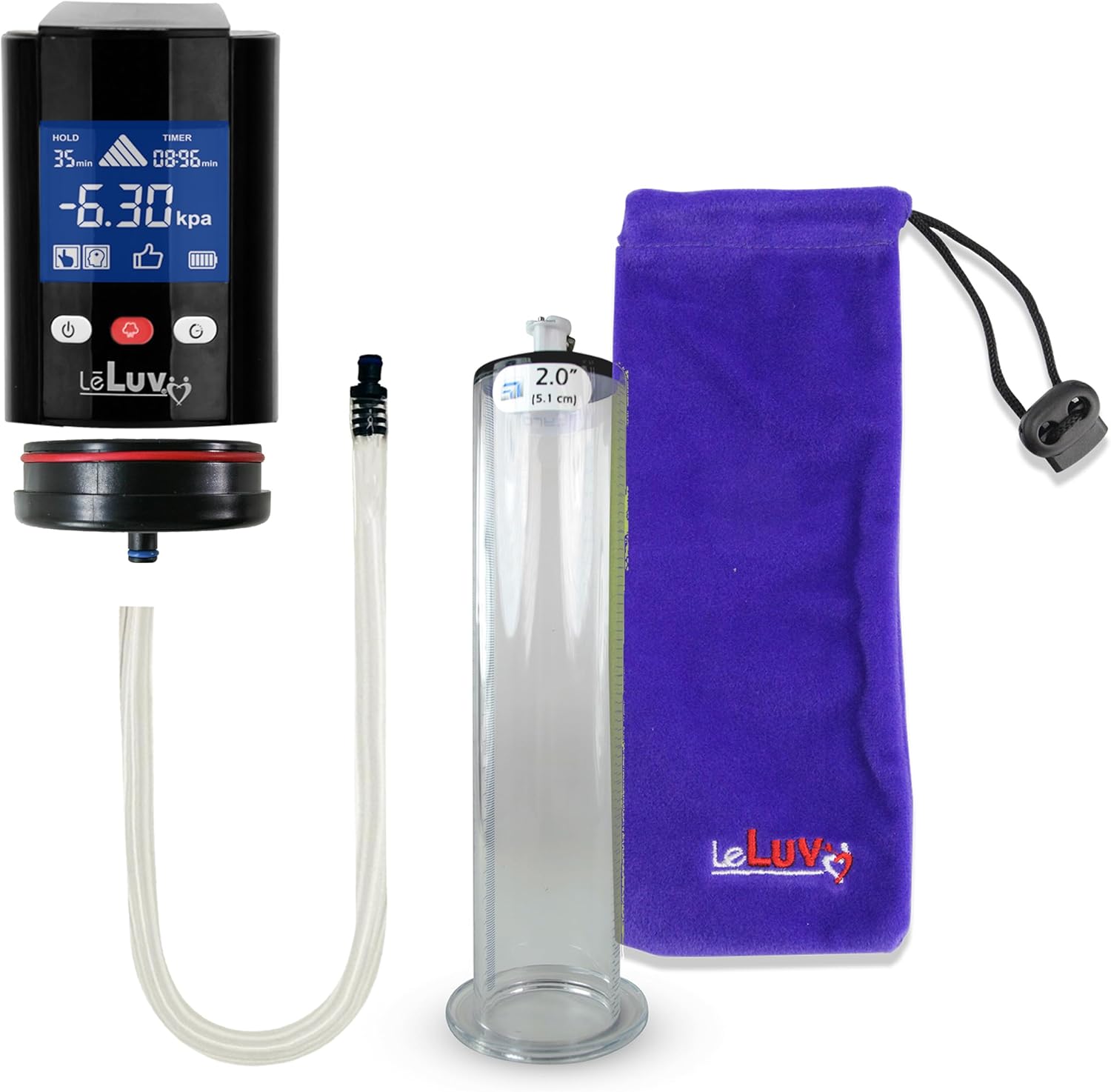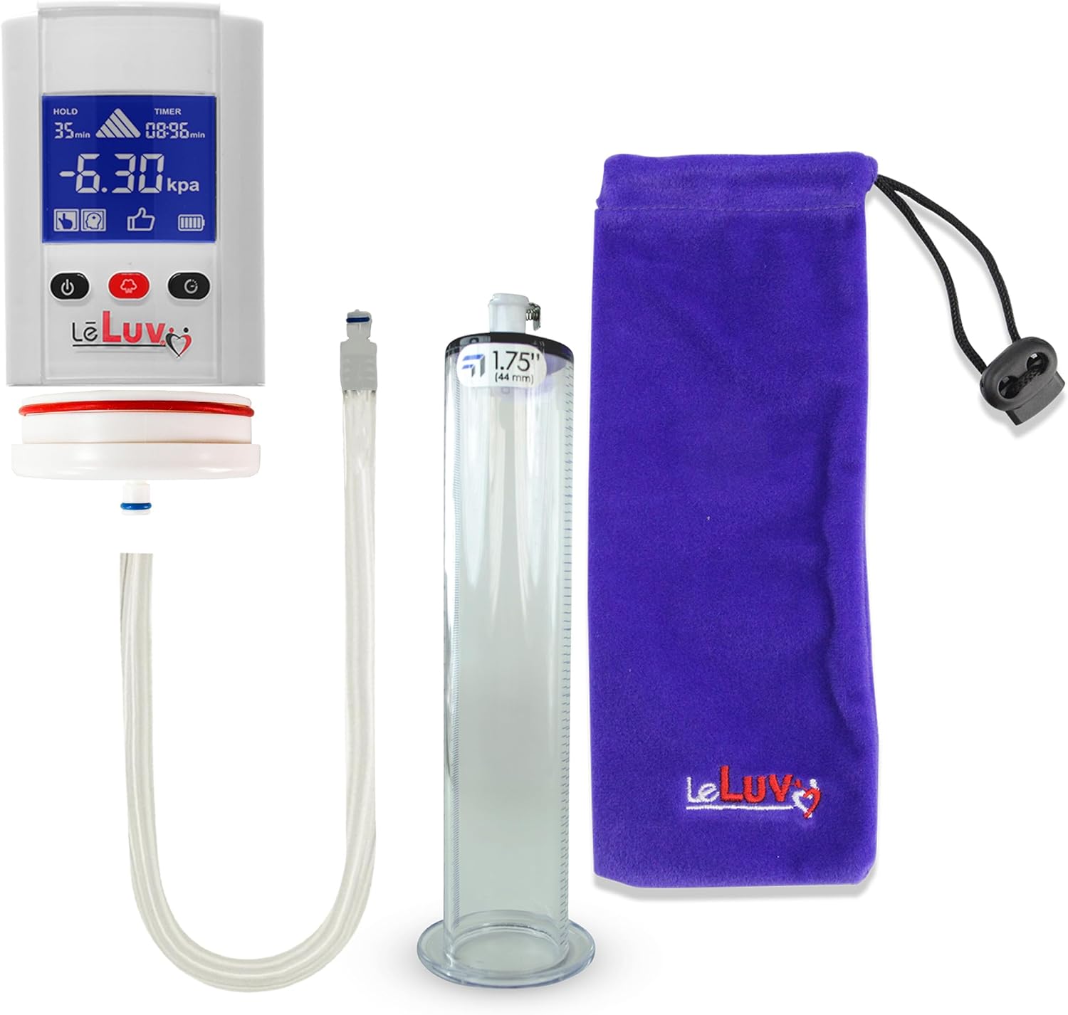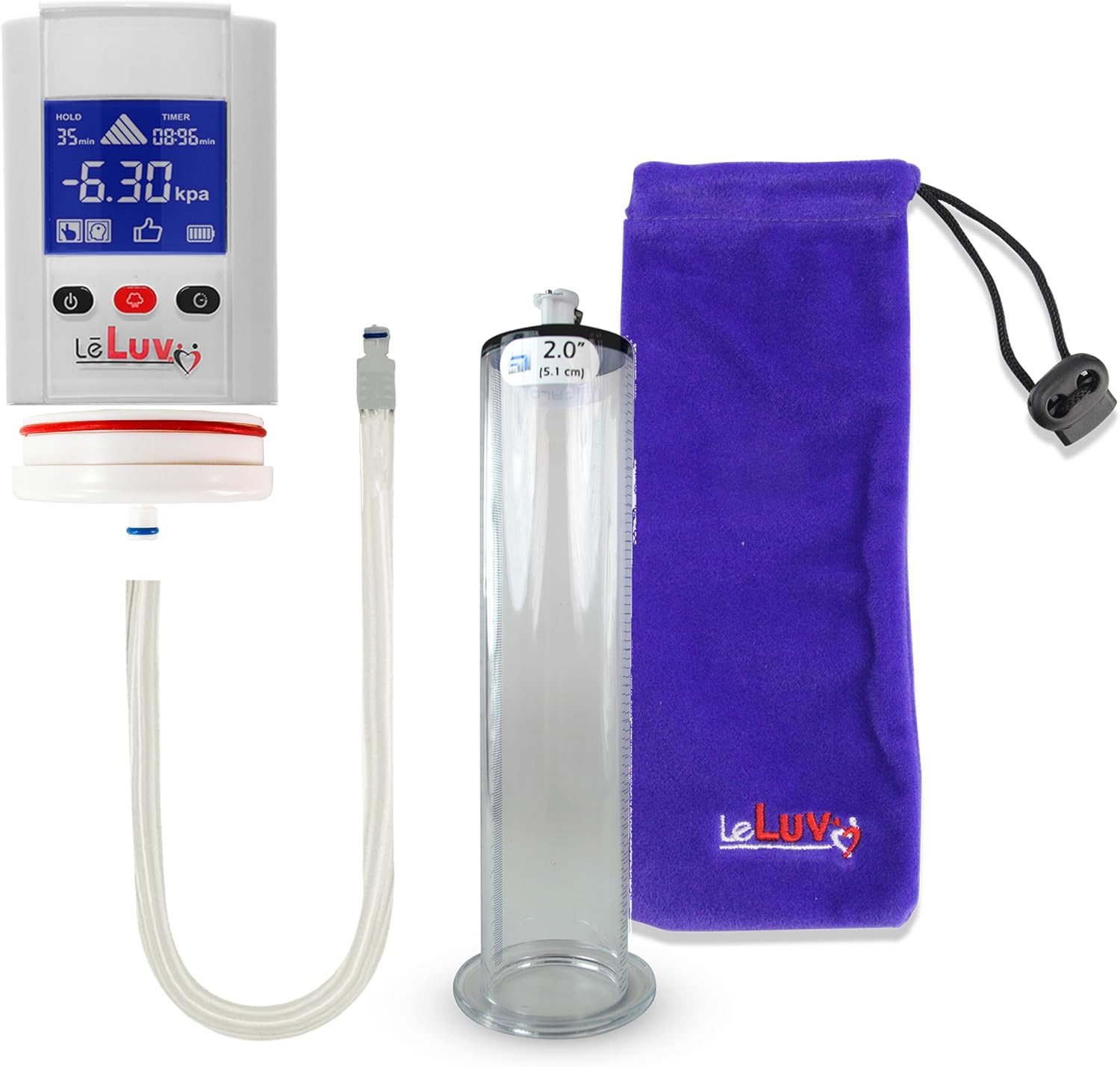 This Smart LCD iPump penis enhancement pump can be operated in a Manual Mode, or Smart Mode. Smart Mode enables you to record the desired vacuum level you want and then utilize that record for up to ten minutes at a time! The Smart Mode will set and hold your desired vacuum level then release it in a cycle for a twenty-minute session. The Smart iPump's operation is very quiet, is rechargeable via a USB cable, and is easy to disassemble for cleaning of the cylinder and sleeves. Always clean with soap or toy cleaner before and after each use. Never immerse the head in water and do not use silicone lubricants. The LeLuv Head Adapter has superb vacuum sealing O-rings and quality ABS construction. Just attach the LeLuv 1/4" Quick-Disconnect Vacuum Hose to the fitting on the Adapter, then press the Adapter into your LeLuv iPump Head! The extra-thick clear, seamless, untapered cylinder is graduated in both inches and centimeters up the side, letting you watch and mark your progress accurately. It includes an extra-wide base flange for comfort without any added accessories. We include 18 inches of kink-resistant hose, and our specially-designed Quick-Disconnect Fittings to offer trouble-free pumping sessions. You can even disconnect the hose from the cylinder and it will maintain vacuum!